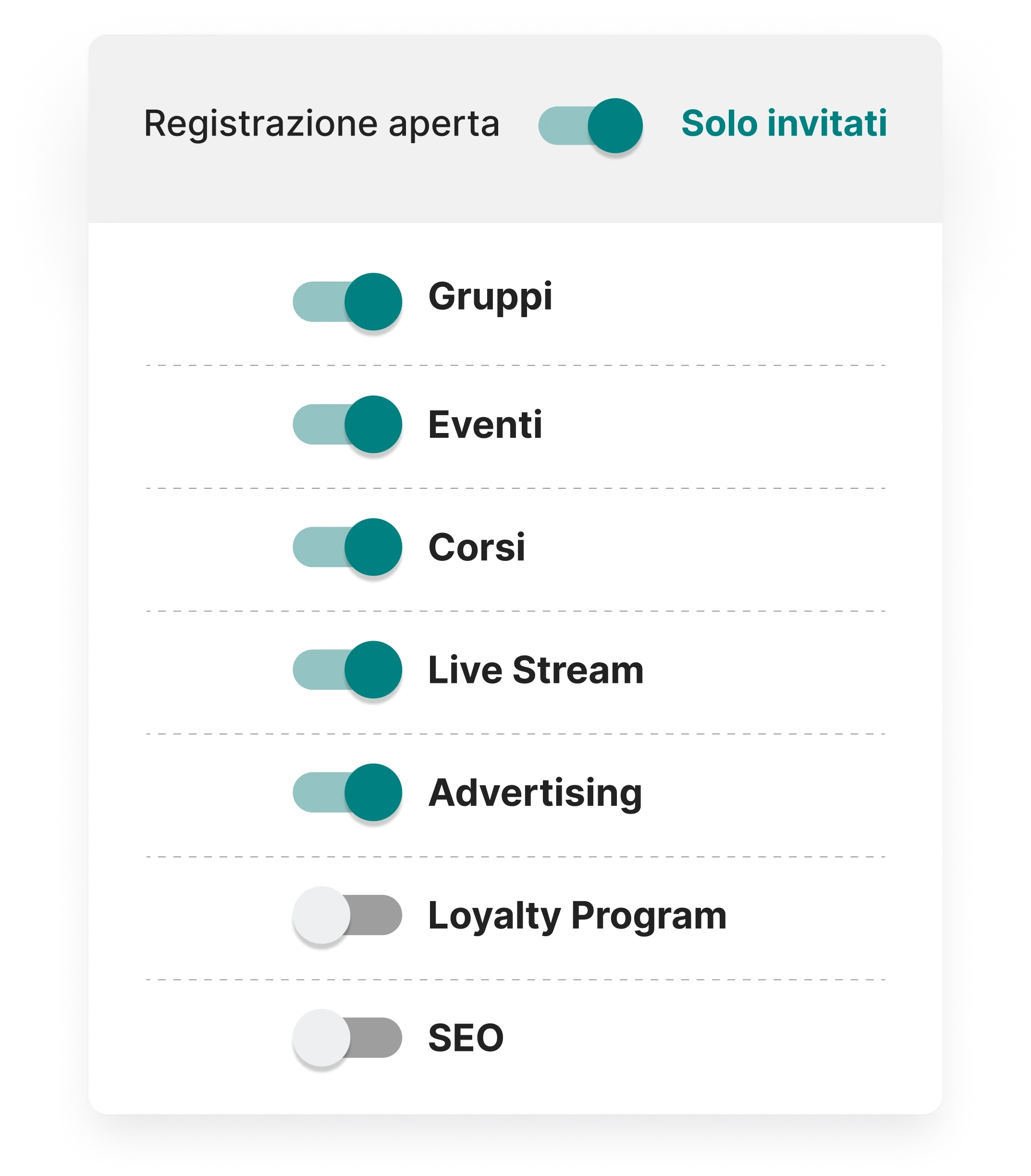 Controllo Completo della Configurazione della Community: Con semplici interruttori puoi attivare o disattivare funzioni e configurare le impostazioni principali per soddisfare le esigenze della tua Community.